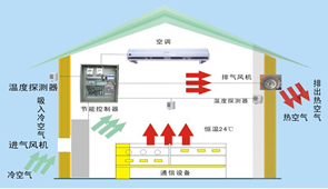 工作原理:智能新風系統(tǒng)通過引入室外冷空氣,對機房溫度進行調(diào)節(jié),當室內(nèi)溫度達到22℃(可設(shè)置),室內(nèi)外溫度差△T≥2℃,智能新風啟動,向室內(nèi)送入過濾后的冷空氣,室內(nèi)溫度降至18℃(可設(shè)置)時,智能新風停機,以此循環(huán)工作。